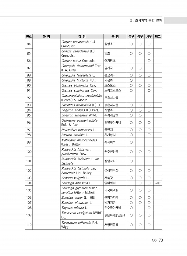 Ⅱ. 조사지역 종합 결과 73 번호 과 명 학 명 국 명 동부 중부 서부 비고 84 Conyza bonariensis L. Cronquist 실망초 ○ ○ ○ 85 Conyza canadensis L. Cronquist 망초 ○ ○ ○ 86 Conyza parva Cronquist 애기망초 ○ 87 Coreopsis drummondii Torr. & A. Gray 금계국 ○ ○ 88 Coreopsis lanceolata L. 큰금계국 ○ ○ ○ 89 Coreopsis tinctoria Nutt. 기생초 ○ 90 Cosmos bipinnatus Cav. 코스모스 ○ ○ ○ 91 Cosmos sulphureus Cav. 노랑코스모스 ○ ○ 92 Crassocephalum crepidioides Benth. S....