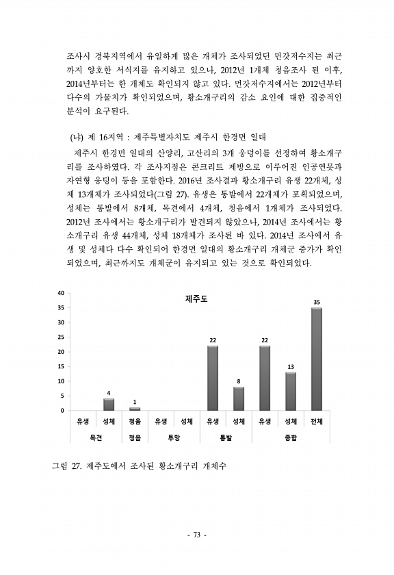 73 조사시 경북지역에서 유일하게 많은 개체가 조사되었던 먼갓저수지는 최근 까지 양호한 서식지를 유지하고 있으나, 2012년 1개체 청음조사 된 이후, 2014년부터는 한 개체도 확인되지 않고 있다. 먼갓저수지에서는 2012년부터 다수의 가물치가 확인되었으며, 황소개구리의 감소 요인에 대한 집중적인 분석이 요구된다. 냐 제 16지역 제주특별자치도 제주시 한경면 일대 제주시 한경면 일대의 산양리, 고산리의 3개 웅덩이를 선정하여 황소개구 리를 조사하였다. 각 조사지점은 콘크리트 제방으로 이루어진 인공연못과 자연형 웅덩이 등을 포함한다. 2016년 조사결과 황소개구리 유생 22개체, 성 체 13개체가 조사되었다 그림 27 유생은 통발에서 22개체가 포획되었으며, 성체는 통발에서 8개체, 목견에서 4개체, 청음에...