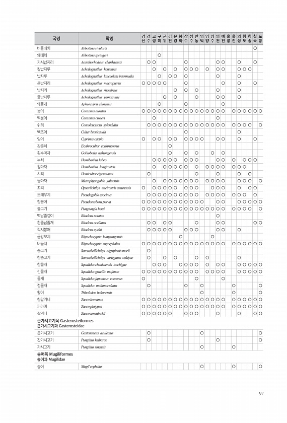 97 버들매치 Abbottina rivularis ○ 왜매치 Abbottina springeri ○ 가시납지리 Acanthorhodeus chankaensis ○ ○ ○ ○ ○ ○ ○ 칼납자루 Acheilognathus koreensis ○ ○ ○ ○ ○ ○ ○ ○ ○ ○ ○ ○ 납자루 Acheilognathus lanceolata intermedia ○ ○ ○ ○ ○ ○ 큰납지리 Acheilognathus macropterus ○ ○ ○ ○ ○ ○ ○ ○ ○ 납지리 Acheilognathus rhombeus ○ ○ ○ ○ ○ 줄납자루 Acheilognathus yamatsutae ○ ○ ○ ○ ○ ○ 왜몰개 Aphyocypris chinensis ○ ○ ○ 붕어 Carassius auratus ○ ○ ○ ...
