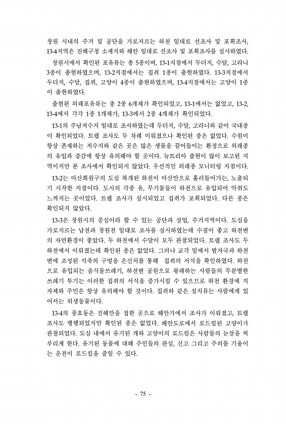 창원 시내의 주거 및 공단을 가로지르는 하천 일대로 선조사 및 포획조사, 13-4지역은 진해구청 소재지와 해안 일대로 선조사 및 포획조사를 실시하였다. 창원시에서 확인된 포유류는 총 5종이며, 13-1지점에서 두더지, 수달, 고라니 3종이 출현하였으며, 13-2지점에서는 집쥐 1종이 출현하였다. 13-3지점에서 두더지, 수달, 집쥐, 고양이 4종이 출현하였으며, 13-4지점에서는 고양이 1종 이 출현하였다. 출현된 외래포유류는 총 2종 6개체가 확인되었고, 13-1에서는 없었고, 13-2, 13-4에서 각각 1종 1개체가, 13-3에서 2종 4개체가 확인되었다. 13-1의 주남저수지 일대로 조사하였는데 두더지, 수달, 고라니와 같이 국내종 이 확인되었다. 트랩 조사도 두 차례 이뤄졌으나 확인된 종은 없었다....