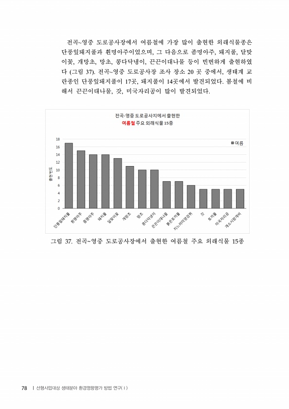 전곡영중 도로공사장에서 여름철에 가장 많이 출현한 외래식물종은 단풍잎돼지풀과 흰명아주이었으며, 그 다음으로 좀명아주, 돼지풀, 달맞 이꽃, 개망초, 망초, 콩다닥냉이, 끈끈이대나물 등이 빈번하게 출현하였 다 그림 37 전곡영중 도로공사장 조사 장소 20 곳 중에서, 생태계 교 란종인 단풍잎돼지풀이 17곳, 돼지풀이 14곳에서 발견되었다. 봄철에 비 해서 끈끈이대나물, 갓, 미국자리공이 많이 발견되었다. 그림 전곡 영중 도로공사장에서 출현한 여름철 주요 외래식물 종 78 | 선형사업대상 생태분야 환경영향평가 방법 연구 Ⅰ