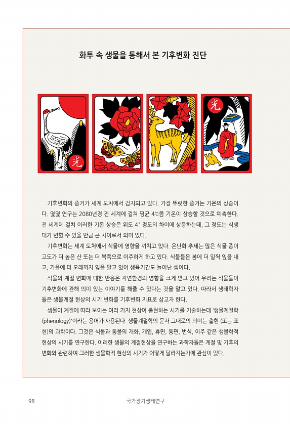 98 국가장기생태연구 화투 속 생물을 통해서 본 기후변화 진단 기후변화의 증거가 세계 도처에서 감지되고 있다. 가장 뚜렷한 증거는 기온의 상승이 다. 몇몇 연구는 2080년경 전 세계에 걸쳐 평균 4℃쯤 기온이 상승할 것으로 예측한다. 전 세계에 걸쳐 이러한 기온 상승은 위도 4° 정도의 차이에 상응하는데, 그 정도는 식생 대가 변할 수 있을 만큼 큰 차이로서 의미 있다. 기후변화는 세계 도처에서 식물에 영향을 끼치고 있다. 온난화 추세는 많은 식물 종이 고도가 더 높은 산 또는 더 북쪽으로 이주하게 하고 있다. 식물들은 봄에 더 일찍 잎을 내 고, 가을에 더 오래까지 잎을 달고 있어 생육기간도 늘어난 셈이다. 식물의 계절 변화에 대한 반응은 자연환경의 영향을 크게 받고 있어 우리는 식물들이 기후변화에 관해...