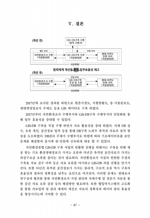 87 Ⅴ. 결론 2017년에 조사된 결과를 바탕으로 현존식생도, 지형현황도, 동·식물분포도, 생태계정밀조사 주제도 등을 GIS 데이터로 구축 하였다. 2017년부터 자연환경조사 수행부서와 GIS DB구축 수행부서의 단일화를 통 해 업무 효율성을 증대할 수 있었다. GIS DB 구축을 직접 수행 하면서 자료 활용성을 증대 하였다. 자체 DB 검 수, 오류 개선, 공간정보 입력 등을 통해 DB구축 노하우 축적과 자료의 질적 향 상을 도모하였다. DB관리 주체가 수행부서로 바뀜에 따라 기초데이터유출 보안 문제를 해결함과 동시에 관·민원에 신속하게 대응 할 수 있었다. 자연환경종합 GIS DB 구축 사업의 원활한 진행을 위해서는 구축을 위해 제 공 받는 기초 환경생태정보가 가지는 오류와 다년간 축적된 공간자료가 가...