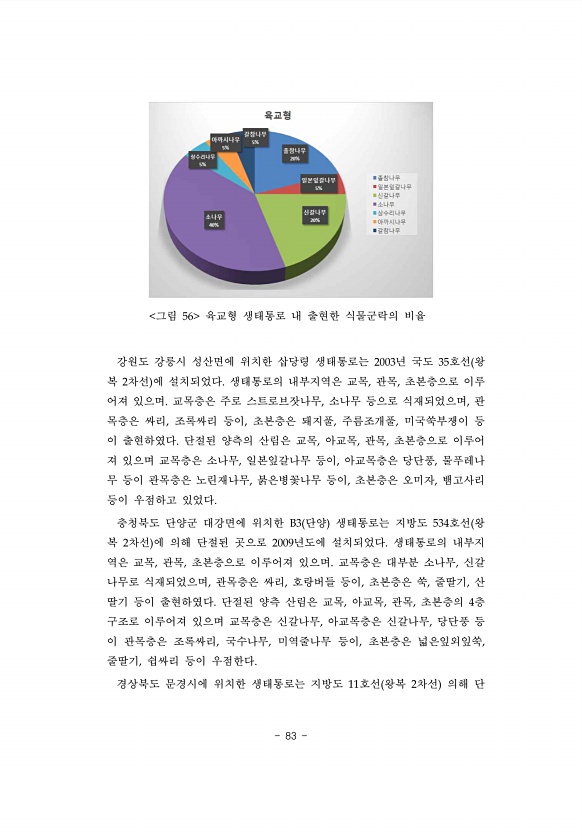 83 그림 56 육교형 생태통로 내 출현한 식물군락의 비율 강원도 강릉시 성산면에 위치한 삽당령 생태통로는 2003년 국도 35호선 왕 복 2차선 에 설치되었다. 생태통로의 내부지역은 교목, 관목, 초본층으로 이루 어져 있으며. 교목층은 주로 스트로브잣나무, 소나무 등으로 식재되었으며, 관 목층은 싸리, 조록싸리 등이, 초본층은 돼지풀, 주름조개풀, 미국쑥부쟁이 등 이 출현하였다. 단절된 양측의 산림은 교목, 아교목, 관목, 초본층으로 이루어 져 있으며 교목층은 소나무, 일본잎갈나무 등이, 아교목층은 당단풍, 물푸레나 무 등이 관목층은 노린재나무, 붉은병꽃나무 등이, 초본층은 오미자, 뱀고사리 등이 우점하고 있었다. 충청북도 단양군 대강면에 위치한 B3 단양 생태통로는 지방도 534호선 왕 복 2차선 에 의...