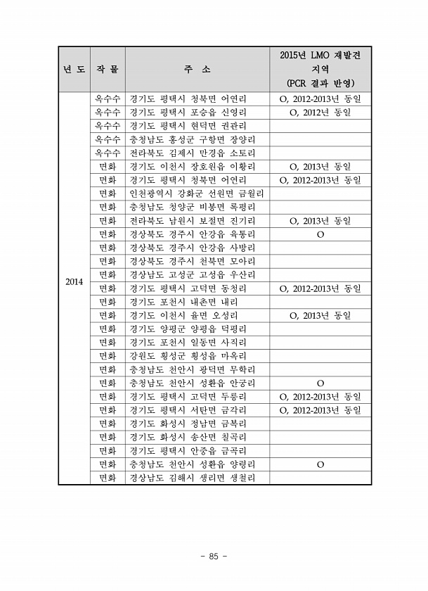 년 도 작 물 주 소 년 재발견 지역 결과 반영 2014 옥수수 경기도 평택시 청북면 어연리 O, 2012-2013년 동일 옥수수 경기도 평택시 포승읍 신영리 O, 2012년 동일 옥수수 경기도 평택시 현덕면 권관리 옥수수 충청남도 홍성군 구항면 장양리 옥수수 전라북도 김제시 만경읍 소토리 면화 경기도 이천시 장호원읍 이황리 O, 2013년 동일 면화 경기도 평택시 청북면 어연리 O, 2012-2013년 동일 면화 인천광역시 강화군 선원면 금월리 면화 충청남도 청양군 비봉면 록평리 면화 전라북도 남원시 보절면 진기리 O, 2013년 동일 면화 경상북도 경주시 안강읍 육통리 O 면화 경상북도 경주시 안강읍 사방리 면화 경상북도 경주시 천북면 모아리 면화 경상남도 고성군 고성읍 우산리 면화 경기도 평택시 고덕면...