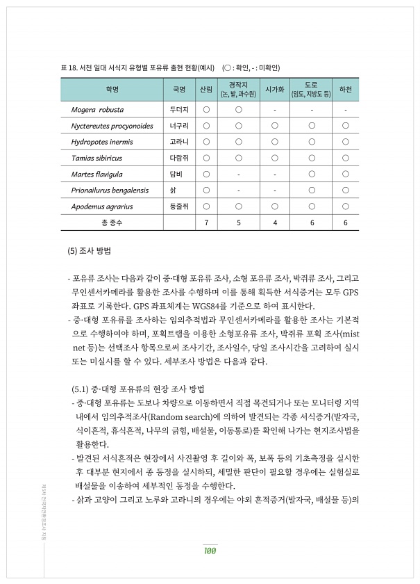 100 제5차 전국자연환경조사 지침 표 18. 서천?일대?서식지?유형별?포유류?출현?현황 예시 ○ 확인, 미확인 학명 국명 산림 경작지 논, 밭, 과수원 시가화 임도, 지방도?등 도로 하천 Mogera robusta Nyctereutes procyonoides Hydropotes inermis Tamias sibiricus Martes flavigula Prionailurus bengalensis Apodemus agrarius 총?종수 두더지 너구리 고라니 다람쥐 담비 삵 등줄쥐 ○ ○ ○ ○ ○ ○ ○ ○ ○ ○ ○ ○ ○ ○ ○ ○ ○ ○ ○ ○ ○ ○ ○ ○ ○ ○ ○ ○ 7 5 4 6 6 5 조사?방법 포유류?조사는?다음과?같이?중·대형?포유류?조사, 소형?포유류?조사, 박쥐류?조사, 그리고 무인센...