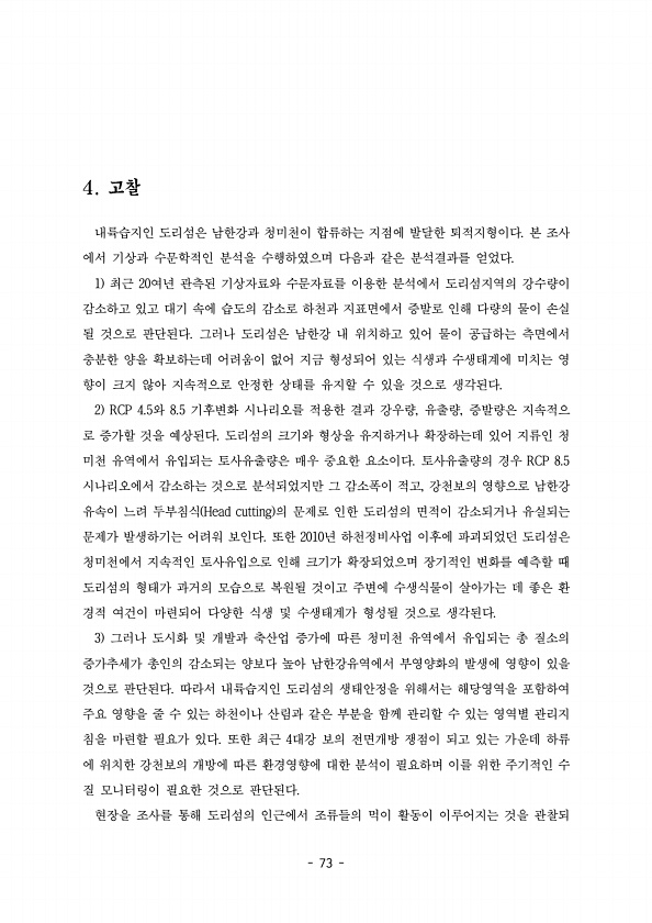 상자 텃밭 vs 실외 텃밭 ●상자 텃밭과 실외 텃밭의 생물다양성의 차이와 그로 인한 생태계서비스 차이를 설명한다. 베란다에 있는 상자 텃밭과 실외 텃밭 중 어느 쪽이 생물다양성이 더 풍부할까요? 그 이유를 생각해서 써봅시다. 실외 텃밭 실외 텃밭에는 가지, 오이, 고추, 상추, 토마토, 고구마 등 여러 작물이 있어서 다양한 종류의 벌과 나비 등이 찾아옵니다. 학습활동지 교사용 ⓒ ESP아시아사무소 74 초등교원을 위한 생태계 서비스지도서는데 어려움이 없어 지금 형성되어 있는 식생과 수생태계에 미치는 영 향이 크지 않아 지속적으로 안정한 상태를 유지할 수 있을 것으로 생각된다. 2 RCP 4.5 8.5 와 기후변화 시나리오를 적용한 결과 강우량 유출량 증발량은 지속적으 , , 로 증가할 것을 예상된다 도리섬의...