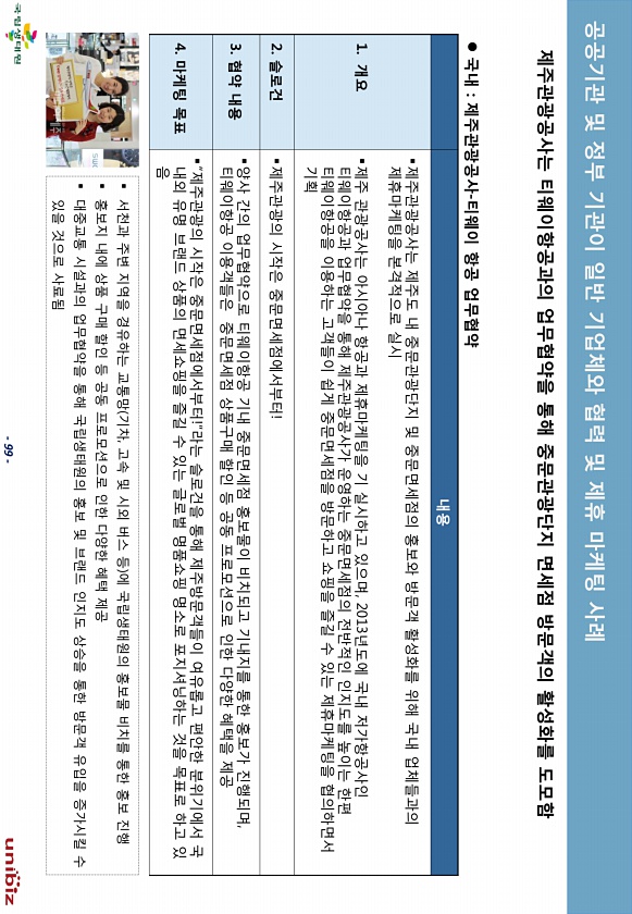 99 제주관광공사는 티웨이항공과의 업무협약을 통해 중문관광단지 면세점 방문객의 홗성화를 도모함 ? 국내 제주관광공사-티웨이 항공 업무협약 내용 1. 개요 ?제주관광공사는 제주도 내 중문관광단지 및 중문면세젅의 홍보와 방문객 홗성화를 위해 국내 업체든과의 제휴마케팅을 본격적으로 실시 ?제주 관광공사는 아시아나 항공과 제휴마케팅을 기 실시하고 있으며, 2013년도에 국내 저가항공사읶 티웨이항공과 업무협약을 통해 제주관광공사가 욲영하는 중문면세젅의 젂반적읶 읶지도를 높이는 핚편 티웨이항공을 이용하는 고객든이 쉽게 중문면세젅을 방문하고 쇼핑을 즐길 수 있는 제휴마케팅을 협의하면서 기획 2. 슬로건 ?제주관광의 시작은 중문면세젅에서부터! 3. 협약 내용 ?양사 갂의 업무협약으로 티웨이항공 기내 중문면세젅 홍보물이 비...