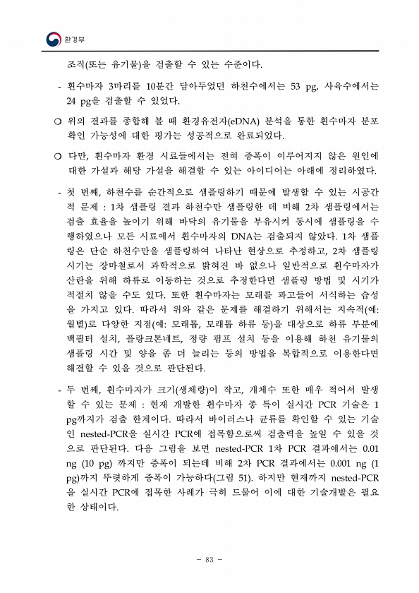 83 조직 또는 유기물 을 검출할 수 있는 수준이다. 흰수마자 3마리를 10분간 담아두었던 하천수에서는 53 pg, 사육수에서는 24 pg을 검출할 수 있었다. ? 위의 결과를 종합해 볼 때 환경유전자 eDNA 분석을 통한 흰수마자 분포 확인 가능성에 대한 평가는 성공적으로 완료되었다. ? 다만, 흰수마자 환경 시료들에서는 전혀 증폭이 이루어지지 않은 원인에 대한 가설과 해당 가설을 해결할 수 있는 아이디어는 아래에 정리하였다. 첫 번째, 하천수를 순간적으로 샘플링하기 때문에 발생할 수 있는 시공간 적 문제 1차 샘플링 결과 하천수만 샘플링한 데 비해 2차 샘플링에서는 검출 효율을 높이기 위해 바닥의 유기물을 부유시켜 동시에 샘플링을 수 행하였으나 모든 시료에서 흰수마자의 DNA는 검출되지 않았다. 1차 샘...