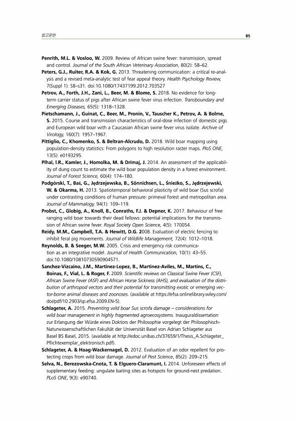 참고문헌 85 Penrith, M.L. & Vosloo, W. 2009. Review of African swine fevertransmission, spread and control. Journal of the South African Veterinary Association, 80 2 58?62. Peters, G.J., Ruiter, R.A. & Kok, G. 2013. Threatening communicationa critical re-analysis and a revised meta-analytic test of fear appeal theory. Health Psychology Review, 7 Suppl 1 S8?s31. doi10.1080/17437199.2012.703527 Petrov, ...