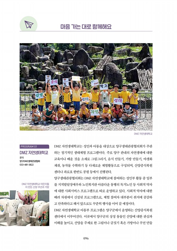 096 DMZ 자연생태학교는 성인과 아동을 대상으로 양구생태관광협의회가 주관 하는 정기적인 생태체험 프로그램이다. 주로 양구 관내의 자연생태에 대한 교육이나 배운 것을 소재로 그림그리기, 음식 만들기, 가방 만들기, 야생화 채취, 농작물 수확하기 등 다채로운 체험활동으로 구성되며, 산양증식복원 센터나 파로호 한반도 공원 등에서 진행된다. 양구생태관광협의회는 DMZ 자연생태학교에 참여하는 성인부 활동 중 일부 를 지적발달장애우와 노인복지관 아름다운 동행의 독거노인 등 사회적 약자 에 대한 사회서비스 프로그램으로 따로 운영하고 있다. 사회적 약자에 대한 배려 차원에서 신설된 프로그램으로, 체험 참여자 대부분이 취지에 공감하 고 만족하다고 해서 앞으로도 꾸준히 행사를 이어 갈 예정이다. DMZ 자연생태학교 아동부...