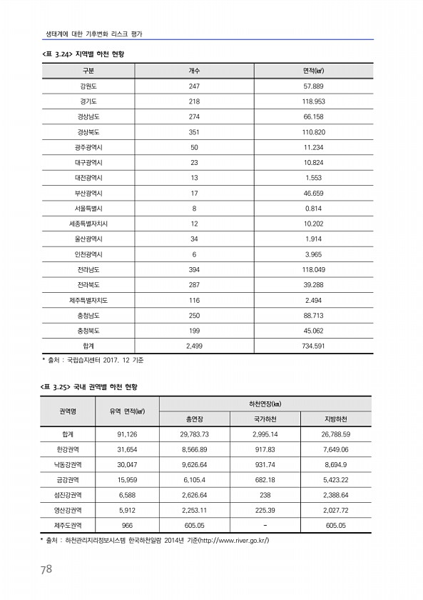 생태계에 대한 기후변화 리스크 평가 78 권역명 유역 면적 ㎢ 하천연장 ㎞ 총연장 국가하천 지방하천 합계 91,126 29,783.73 2,995.14 26,788.59 한강권역 31,654 8,566.89 917.83 7,649.06 낙동강권역 30,047 9,626.64 931.74 8,694.9 금강권역 15,959 6,105.4 682.18 5,423.22 섬진강권역 6,588 2,626.64 238 2,388.64 영산강권역 5,912 2,253.11 225.39 2,027.72 제주도권역 966 605.05 605.05 * 출처 하천관리지리정보시스템 한국하천일람 2014년 기준 http//www.river.go.kr/ 표 3.25 국내 권역별 하천 현황 구분 개수 면적 ㎢ 강원도 247 57.88...