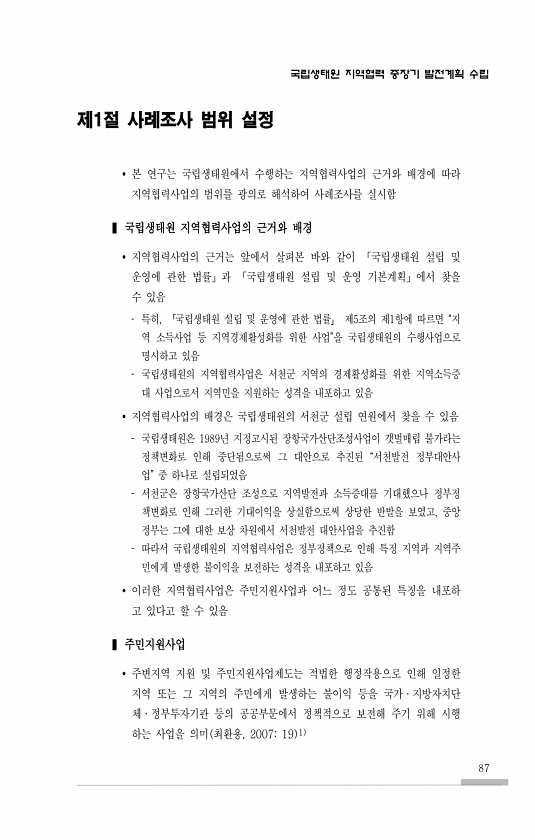 국립생태원 지역협력 중장기 발전계획 수립 87 제1절 사례조사 범위 설정 ? 본 연구는 국립생태원에서 수행하는 지역협력사업의 근거와 배경에 따라 지역협력사업의 범위를 광의로 해석하여 사례조사를 실시함 ? 국립생태원 지역협력사업의 근거와 배경 ? 지역협력사업의 근거는 앞에서 살펴본 바와 같이 「국립생태원 설립 및 운영에 관한 법률」과 「국립생태원 설립 및 운영 기본계획」에서 찾을 수 있음 특히, 「국립생태원 설립 및 운영에 관한 법률」 제5조의 제1항에 따르면 “지 역 소득사업 등 지역경제활성화를 위한 사업”을 국립생태원의 수행사업으로 명시하고 있음 국립생태원의 지역협력사업은 서천군 지역의 경제활성화를 위한 지역소득증 대 사업으로서 지역민을 지원하는 성격을 내포하고 있음 ? 지역협력사업의 배경은 국립생...