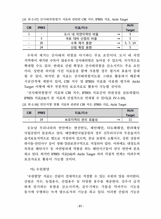 CBI IPBES 지표/지수 Aichi Target 1 도시 내 자연지역의 비율 → 5 3 국토 대비 산림의 비율 → 5 20 수목 제거 총량 → 5, 7, 14 24 산림 확장 동향 → 5 [표 Ⅳ-1-17] 산사태위험평가 지표와 관련된 CBI 지수, IPBES 지표, Aichi Target 수목의 제거는 산사태의 위험을 야기하는 주요 요인이다. 도시 내 자연 지역에서 제거된 수목이 많을수록 산사태위험은 높아질 수 있으며, 국가적으로 확대할 수도 있다. 반대로 산림 확장은 산사태위험을 감소시키는 주요 요인 이다. 상반된 의미를 가진 지표들을 함께 사용할 경우 평가의 효율이 증대 될 수 있다. 하지만 본 지표는 산사태위험지도를 그대로 활용하기 때문에 시공간적에 제한이 있어, CBI 지수 및 IPBES 지표를...