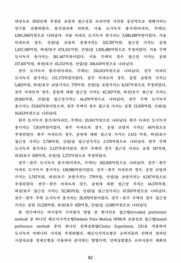 82 대상으로 2016년에 추정된 조망과 접근성을 프리미엄 가치를 공간적으로 재해석하는 연구를 진행하였다. 분석결과에 의하면, 서울 도시녹지 총가치 아파트, 주택 는 4,061,956억원으로 나타났다. 서울 아파트 도시녹지 총가치는 3,680,489억원이었다. 서울 아파트의 경우, 산림/숲 조망의 경제가치는 322,397억원, 접근성 가치는 공원 1,657,180억원, 하천/호수 674,431억원, 산림/숲 1,026,480억원으로 추정되었다. 서울 주택 도시녹지 총가치는 381,467억원이었다. 서울 주택의 경우 접근성 가치는 공원 227,837억원, 하천/호수 45,212억원, 산림/숲 108,418억원으로 나타났다. 전주 도시녹지 총가치 아파트, 주택 는 155,015억원으로 나타났다. 전주 아파트 도...