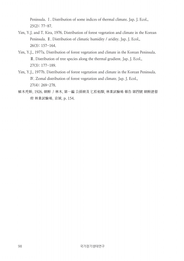 98 국가장기생태연구 Peninsula. Ⅰ. Distribution of some indices of thermal climate. Jap. J. Ecol., 25 2 77-87. Yim, Y.J. and T. Kira, 1976. Distribution of forest vegetation and climate in the Korean Peninsula. Ⅱ. Distribution of climatic humidity aridity. Jap. J. Ecol., 26 3 157-164. Yim, Y.J., 1977a. Distribution of forest vegetation and climate in the Korean Peninsula. Ⅲ. Distribution of tree species al...