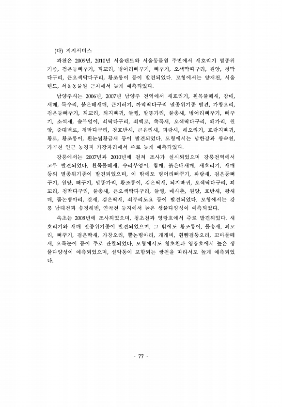 77 다 지지서비스 과천은 2009년, 2010년 서울랜드와 서울동물원 주변에서 새호리기 멸종위 기종, 검은등뻐꾸기, 꾀꼬리, 벙어리뻐꾸기, 뻐꾸기, 오색딱따구리, 원앙, 청딱 다구리, 큰오색딱다구리, 황조롱이 등이 발견되었다. 모형에서는 양재천, 서울 랜드, 서울동물원 근처에서 높게 예측되었다. 남양주시는 2006년, 2007년 남양주 전역에서 새호리기, 흰목물떼새, 참매, 새매, 독수리, 붉은배새매, 큰기러기, 까막딱다구리 멸종위기종 발견, 가창오리, 검은등뻐꾸기, 꾀꼬리, 되지빠귀, 들꿩, 말똥가리, 물총새, 벙어리뻐꾸기, 뻐꾸 기, 소쩍새, 솔부엉이, 쇠딱다구리, 쇠백로, 쏙독새, 오색딱다구리, 왜가리, 원 앙, 중대백로, 청딱다구리, 청호반새, 큰유리새, 파랑새, 해오라기, 호랑지빠귀, 황로, 황조...