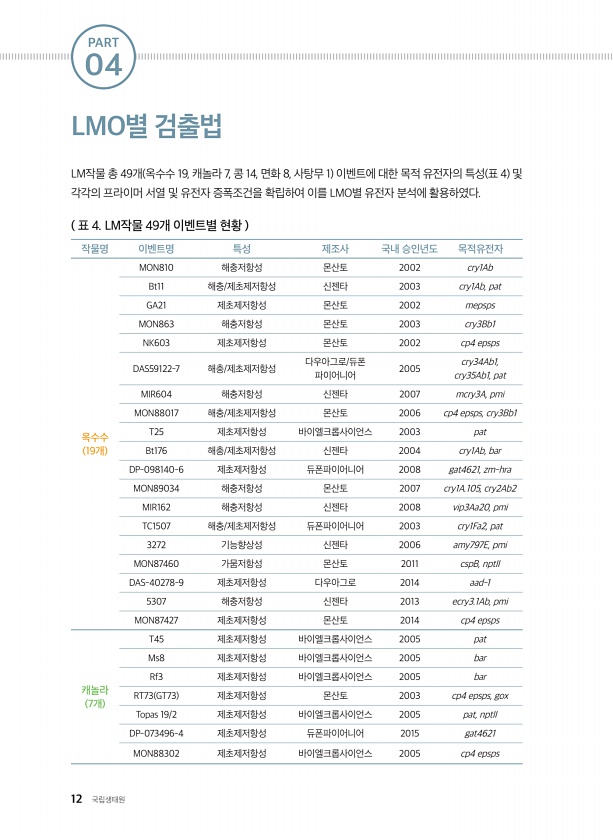 12 국립생태원 LMO별 검출법 LM작물 총 49개 옥수수 19, 캐놀라 7, 콩 14, 면화 8, 사탕무 1 이벤트에 대한 목적 유전자의 특성 표 4 및 각각의 프라이머 서열 및 유전자 증폭조건을 확립하여 이를 LMO별 유전자 분석에 활용하였다. 표 4. LM작물 49개 이벤트별 현황 작물명 이벤트명 특성 제조사 국내 승인년도 목적유전자 옥수수 19개 MON810 해충저항성 몬산토 2002 cry1Ab Bt11 해충/제초제저항성 신젠타 2003 cry1Ab, pat GA21 제초제저항성 몬산토 2002 mepsps MON863 해충저항성 몬산토 2003 cry3Bb1 NK603 제초제저항성 몬산토 2002 cp4 epsps DAS59122-7 해충/제초제저항성 다우아그로/듀폰 파이어니어 2005 cry34...