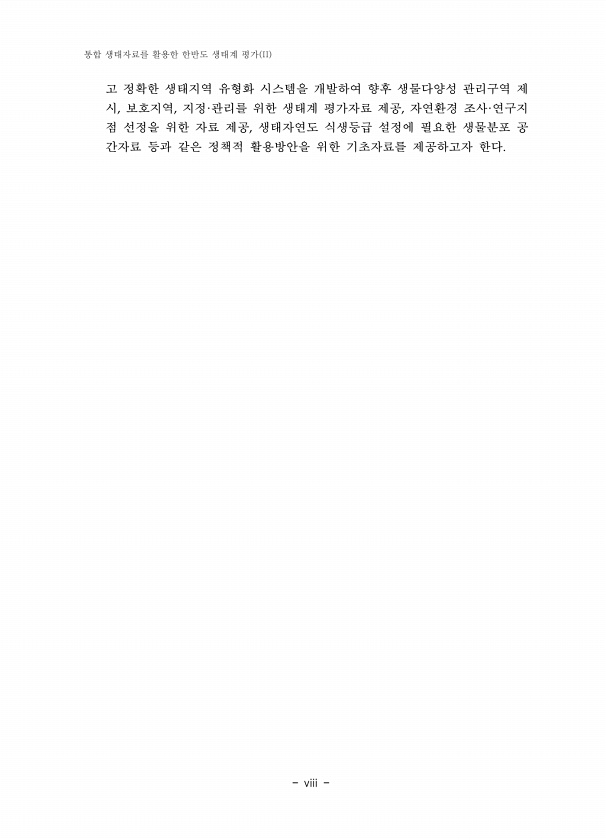 viii 고 정확한 생태지역 유형화 시스템을 개발하여 향후 생물다양성 관리구역 제 시 보호지역 지정 관리를 위한 생태계 평가자료 제공 자연환경 조사 연구지 점 선정을 위한 자료 제공 생태자연도 식생등급 설정에 필요한 생물분포 공 간자료 등과 같은 정책적 활용방안을 위한 기초자료를 제공하고자 한다 통합 생태자료를 활용한 한반도 생태계 평가 II