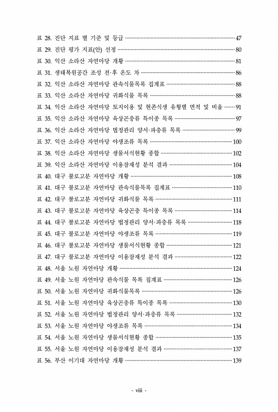viii 표 28. 진단 지표 별 기준 및 등급 ·············································································47 표 29. 진단 평가 지표 안 선정 ··················································································80 표 30. 익산 소라산 자연마당 개황 ·············································································81 표 31. 생태복원공간 조성 전·후 온도 차 ······························································...