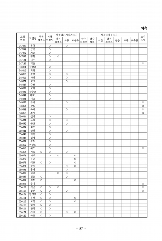 87 도엽 번호 도엽명 식생도 현존 현황도 지형 양서 멸종위기서식지조사 생물다양성조사 고시 도엽 파충류 조류 포유류 무척추 담수 담수 어류 식물 파충류 양서 곤충 조류 포유류 347083 우학 ○ ○ 347091 금당 ○ 347092 거금 ○ 347093 평일 ○ ○ 347131 덕우 ○ 347143 덕촌 ○ 348011 삼천포 ○ 348012 학림 ○ 348013 창선 ○ ○ 348014 사량 ○ ○ 348021 고성 ○ 348023 추도 ○ 348032 고현 ○ 348034 장승포 ○ 348041 옥포1 ○ 348051 미조 ○ 348052 두미 ○ ○ 348054 갈도 ○ 348061 욕지 ○ ○ 348063 좌사 ○ 356024 신시 ○ 356031 오식 ○ ○ 356032 군산 ○ ○ 356034 ...