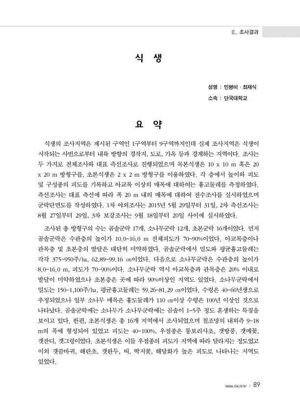 Ⅱ. 조사결과 www.nie.re.kr ? 89 식 생 성명 민병미·최재식 소속 단국대학교 요 약 식생의 조사지역은 제시된 구역인 1구역부터 9구역까지인데 실제 조사지역은 식생이 시작되는 사빈으로부터 내륙 방향의 경작지, 도로, 가옥 등과 경계하는 지역이다. 조사는 두 가지로 전체조사와 대표 측선조사로 진행되었으며 목본식생은 10 x 10 m 혹은 20 x 20 m 방형구를, 초본식생은 2 x 2 m 방형구를 이용하였다. 각 층에서 높이와 피도 및 구성종의 피도를 기록하고 아교목 이상의 매목에 대하여는 흉고둘레를 측정하였다. 측선조사는 대표 측선에 따라 폭 20 m 내의 매목에 대하여 전수조사를 실시하였으며 군락단면도를 작성하였다. 1차 야외조사는 2015년 5월 29일부터 31일, 2차 측선조사는 8월 2...