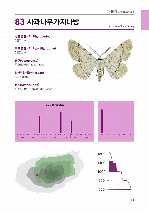 99 자나방과 Geometridae 성충 출현시기 Flight period 5월 May 최고 출현시기 Peak fight time 5월 May 출현 Occurrence 국소 local 1100-1500m 날개편길이 Wingspan 43 52mm 분포 Distribution 한반도 전역 Korea , 일본 Japan Lassaba nikkonis Butler M J J A S O M J J A S O M J J A S O M J J A S O M J J A S O M J J A S O M J J A S O May Jun Jul Aug Sep Oct 2009 2010 2011 2012 2013 2014 2015 Total of 12 individuals 83사과나무가지나방