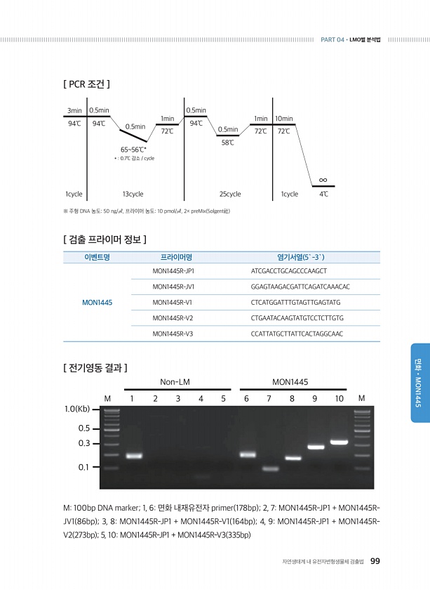 자연생태계 내 유전자변형생물체 검출법 99 PART 04?LMO별 분석법 면화?MON1445 [ 검출 프라이머 정보 ] 이벤트명 프라이머명 염기서열 5`-3` MON1445 MON1445R-JP1 ATCGACCTGCAGCCCAAGCT MON1445R-JV1 GGAGTAAGACGATTCAGATCAAACAC MON1445R-V1 CTCATGGATTTGTAGTTGAGTATG MON1445R-V2 CTGAATACAAGTATGTCCTCTTGTG MON1445R-V3 CCATTATGCTTATTCACTAGGCAAC M100bp DNA marker; 1, 6면화 내재유전자 primer 178bp ; 2, 7MON1445R-JP1 + MON1445RJV1 86bp ; 3, 8MON1445R-JP1 + MON1445R-V1 ...