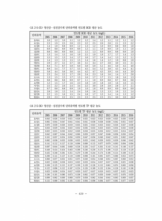 429 단위유역 연도별 BOD 평균 농도 mg/L 2005 2006 2007 2008 2009 2010 2011 2012 2013 2014 2015 2016 동복A 1.0 1.2 1.0 1.1 1.2 1.2 1.4 1.2 1.1 1.2 1.1 1.2 보성A 2.3 1.9 2.5 2.0 2.3 2.2 2.5 2.0 2.0 2.1 2.3 2.2 보성B 1.4 1.0 0.8 0.9 1.2 1.3 1.2 1.0 0.9 0.8 0.9 1.0 섬본A 0.9 0.8 0.9 0.9 0.9 1.2 1.1 1.0 0.9 1.0 1.1 1.0 섬본B 0.8 0.8 0.9 0.8 1.2 1.5 1.3 0.9 0.9 0.8 0.9 1.0 섬본C 1.3 1.4 1.5 1.6 1.9 2.1 1.9 1.9 1.7 1.7 1.4 1.3 ...