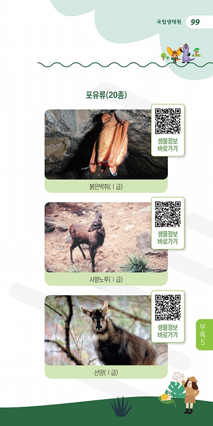 99 포유류 20종 붉은박쥐 Ⅰ급 사향노루 Ⅰ급 산양 Ⅰ급 생물정보 바로가기 생물정보 바로가기 생물정보 바로가기 부 록5