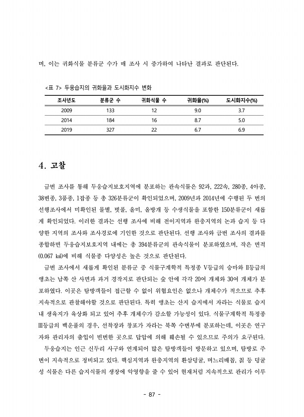 87 며, 이는 귀화식물 분류군 수가 매 조사 시 증가하여 나타난 결과로 판단된다. 조사년도 분류군 수 귀화식물 수 귀화율 % 도시화지수 % 2009 133 12 9.0 3.7 2014 184 16 8.7 5.0 2019 327 22 6.7 6.9 표 7 두웅습지의 귀화율과 도시화지수 변화 4. 고찰 금번 조사를 통해 두웅습지보호지역에 분포하는 관속식물은 92과, 222속, 280종, 4아종, 38변종, 3품종, 1잡종 등 총 326분류군이 확인되었으며, 2009년과 2014년에 수행된 두 번의 선행조사에서 미확인된 물별, 벗풀, 올미, 올방개 등 수생식물을 포함한 150분류군이 새롭 게 확인되었다. 이러한 결과는 선행 조사에 비해 전이지역과 완충지역의 논과 습지 등 다 양한 지역의 조사와 조사경로에 기인한...