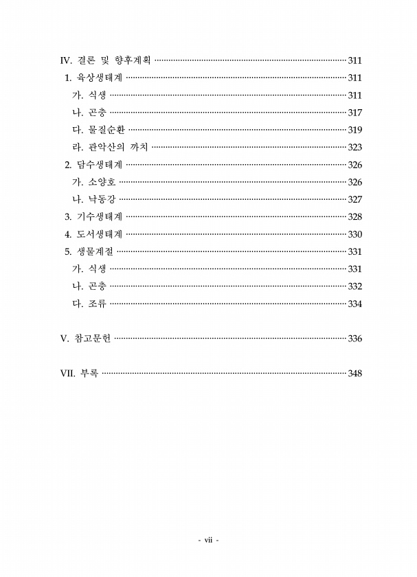 vii IV. 결론 및 향후계획 ··················································································311 1. 육상생태계 ·······························································································311 가. 식생 ······································································································311 나. 곤충 ······································································...
