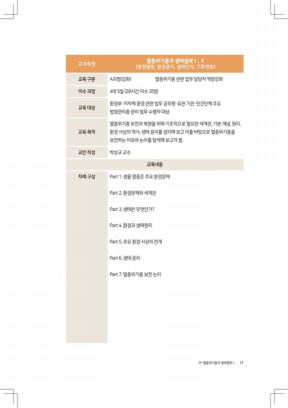 01 멸종위기종과 생태철학Ⅰ 11 교과목명 멸종위기종과 생태철학Ⅰ, Ⅱ 환경철학, 환경윤리, 생태인식, 기후변화 교육 구분 A과정 강화 멸종위기종 관련 업무 담당자 역량강화 이수 과정 4박 5일 28시간 이수 과정 교육 대상 환경부·지자체 환경 관련 업무 공무원·유관 기관·민간단체 주요 법정관리종 관리 업무 수행자 대상 교육 목적 멸종위기종 보전과 복원을 위해 기초적으로 필요한 세계관, 기본 개념, 원리, 환경 사상의 역사, 생태 윤리를 생각해 보고 이를 바탕으로 멸종위기종을 보전하는 이유와 논리를 탐색해 보고자 함. 교안 작성 박상규 교수 교육내용 차례 구성 Part 1. 생물 멸종은 주요 환경문제 Part 2. 환경문제와 세계관 Part 3. 생태란 무엇인가? Part 4. 환경과 생태원리 Part 5....