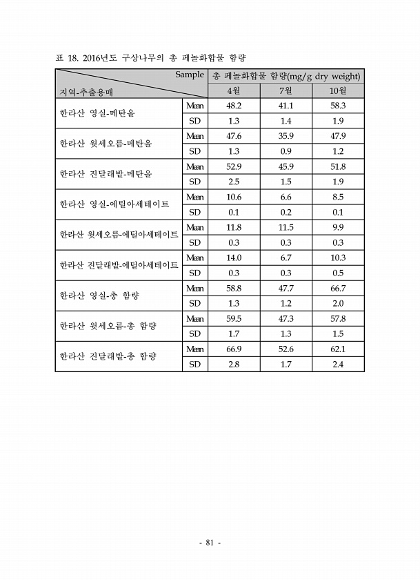 81 Sample 지역-추출용매 총 페놀화합물 함량 mg/g dry weight 4월 7월 10월 한라산 영실-메탄올 Mean 48.2 41.1 58.3 SD 1.3 1.4 1.9 한라산 윗세오름-메탄올 Mean 47.6 35.9 47.9 SD 1.3 0.9 1.2 한라산 진달래밭-메탄올 Mean 52.9 45.9 51.8 SD 2.5 1.5 1.9 한라산 영실-에틸아세테이트 Mean 10.6 6.6 8.5 SD 0.1 0.2 0.1 한라산 윗세오름-에틸아세테이트 Mean 11.8 11.5 9.9 SD 0.3 0.3 0.3 한라산 진달래밭-에틸아세테이트 Mean 14.0 6.7 10.3 SD 0.3 0.3 0.5 한라산 영실-총 함량 Mean 58.8 47.7 66.7 SD 1.3 1.2 2.0 한라산 윗세...