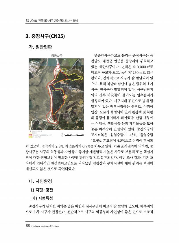 2018 전국해안사구 자연환경조사 충남 88 ? National Institute of Ecology 3. CN25 병술안사구라고도 불리는 중장사구는 충 청남도 태안군 안면읍 중장리에 위치하고 있는 해안사구이다. 면적은 410,000 ㎡로 비교적 규모가 크고, 폭이 약 250m 로 넓은 편이다. 전체적으로 사구가 잘 발달되어 있 으며, 특히 북단과 남단에 넓은 범위의 초기 사구, 전사구가 발달되어 있다. 사구남단지 역의 경우 바닷물이 들어오는 염수습지가 형성되어 있다. 사구지대 뒤편으로 넓게 발 달되어 있는 배후산림에는 산책로, 야외야 영장, 도로가 형성되어 있어 관광객 및 차량 의 통행이 용이하게 되어있다. 산림 내부에 는 어업용, 생활용품 등의 폐기물들을 모아 놓는 야적장이 건설되어 있다. 중장사구의 토...