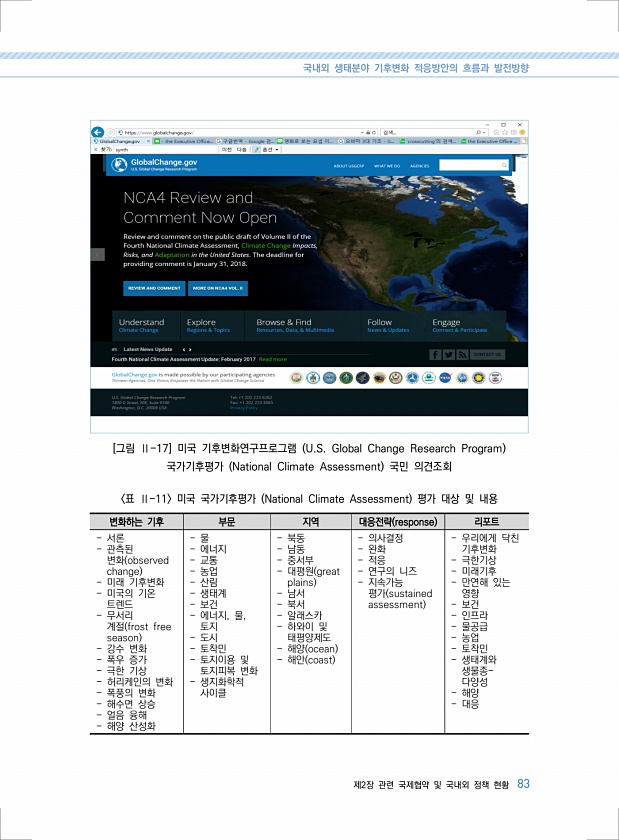 국내외 생태분야 기후변화 적응방안의 흐름과 발전방향 제2장 관련 국제협약 및 국내외 정책 현황 83 [그림 Ⅱ-17] 미국 기후변화연구프로그램 U.S. Global Change Research Program 국가기후평가 National Climate Assessment 국민 의견조회 변화하는 기후 부문 지역 대응전략 response 리포트 서론 관측된 변화 observed change 미래 기후변화 미국의 기온 트렌드 무서리 계절 frost free season 강수 변화 폭우 증가 극한 기상 허리케인의 변화 폭풍의 변화 해수면 상승 얼음 융해 해양 산성화 물 에너지 교통 농업 산림 생태계 보건 에너지, 물, 토지 도시 토착민 토지이용 및 토지피복 변화 생지화학적 사이클 북동 남동 중서부 대평원 great ...