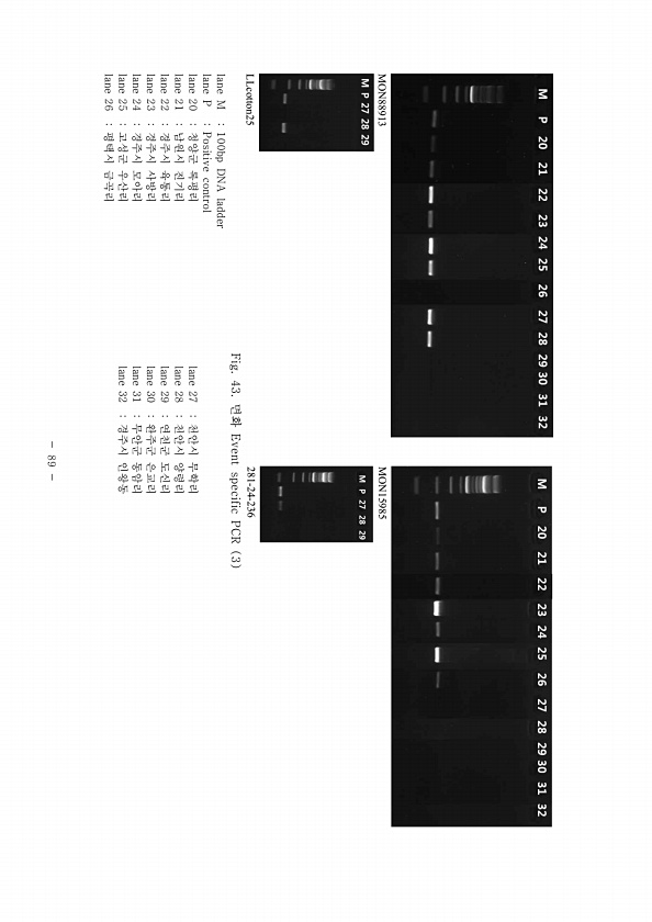 89 MON88913 MON15985 281-24-236 Fig. 43. 면화 Event specific PCR 3 lane M 100bp DNA ladder lane P Positive control lane 20 청양군 록평리 lane 27 천안시 무학리 lane 21 남원시 진기리 lane 28 천안시 양령리 lane 22 경주시 육통리 lane 29 연천군 도신리 lane 23 경주시 사방리 lane 30 완주군 은교리 lane 24 경주시 모아리 lane 31 무안군 동암리 lane 25 고성군 우산리 lane 32 경주시 인왕동 lane 26 평택시 금곡리 M P 27 28 29LLcotton25