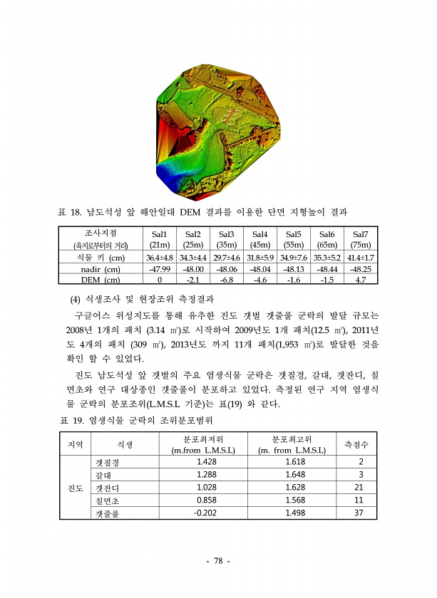 78 지역 식생 분포최저위 m.from L.M.S.L 분포최고위 m. from L.M.S.L 측점수 진도 갯질경 1.428 1.618 2 갈대 1.288 1.648 3 갯잔디 1.028 1.628 21 칠면초 0.858 1.568 11 갯줄풀 -0.202 1.498 37 표 19. 염생식물 군락의 조위분포범위 표 18. 남도석성 앞 해안일대 DEM 결과를 이용한 단면 지형높이 결과 조사지점 육지로부터의 거리 Sal1 21m Sal2 25m Sal3 35m Sal4 45m Sal5 55m Sal6 65m Sal7 75m 식물 키 cm 36.4±4.8 34.3±4.4 29.7±4.6 31.8±5.9 34.9±7.6 35.3±5.2 41.4±1.7 nadir cm -47.99 -48.00 -48.06 -48.04...
