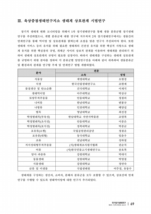 육상중점생태연구지소 생태계 상호관계 시범연구 장기적 생태계 변화 모니터링을 위해서 차 장기생태연구를 통해 생물 분류군별 장기생태 연구를 추진하였으나 개별 분류군에 대한 연구에 치우쳐져 차 장기생태연구에서는 생물간의 연계연구를 통해 먹이망 및 상호관계를 밝히는데 초점을 맞춘 연구가 추진되어야 한다 또한 생태계 서비스 등의 유지를 위해 필요한 생태계의 건전성 유지를 위한 핵심적 사항으로 생태 계 유지를 위한 핵심종의 규명 개체군 사이의 상보적 관계를 이용하여 생태계를 관리하기 위 하여 생태계 상호관계의 규명이 필요한 실정이다 따라서 생태계를 구성하는 생태계 상호관계 를 규명하기 위한 분야를 정하여 각 분류군별 담당연구진을 아래와 같이 위촉하여 생물분류군 및 환경과의 관계를 연구할 주제 및 연계연구 방법 개발하였...