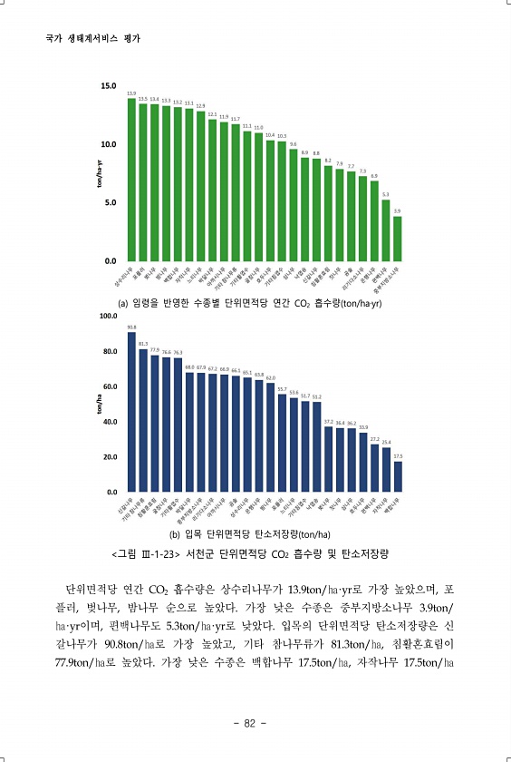 국가 생태계서비스 평가 82 a 임령을 반영한 수종별 단위면적당 연간 CO2 흡수량 ton/ha·yr b 입목 단위면적당 탄소저장량 ton/ha 그림 Ⅲ-1-23 서천군 단위면적당 CO2 흡수량 및 탄소저장량 단위면적당 연간 CO2 흡수량은 상수리나무가 13.9ton/㏊·yr로 가장 높았으며, 포 플러, 벚나무, 밤나무 순으로 높았다. 가장 낮은 수종은 중부지방소나무 3.9ton/ ㏊·yr이며, 편백나무도 5.3ton/㏊·yr로 낮았다. 입목의 단위면적당 탄소저장량은 신 갈나무가 90.8ton/㏊로 가장 높았고, 기타 참나무류가 81.3ton/㏊, 침활혼효림이 77.9ton/㏊로 높았다. 가장 낮은 수종은 백합나무 17.5ton/㏊, 자작나무17.5ton/㏊