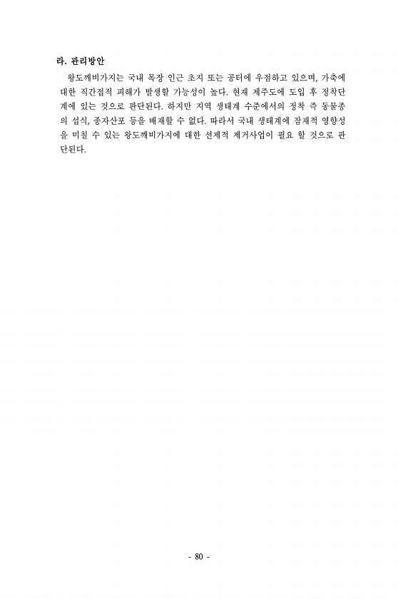 80 라. 관리방안 왕도깨비가지는 국내 목장 인근 초지 또는 공터에 우점하고 있으며, 가축에 대한 직간접적 피해가 발생할 가능성이 높다. 현재 제주도에 도입 후 정착단 계에 있는 것으로 판단된다. 하지만 지역 생태계 수준에서의 정착 즉 동물종 의 섭식, 종자산포 등을 배재할 수 없다. 따라서 국내 생태계에 잠재적 영향성 을 미칠 수 있는 왕도깨비가지에 대한 선제적 제거사업이 필요 할 것으로 판단된다.