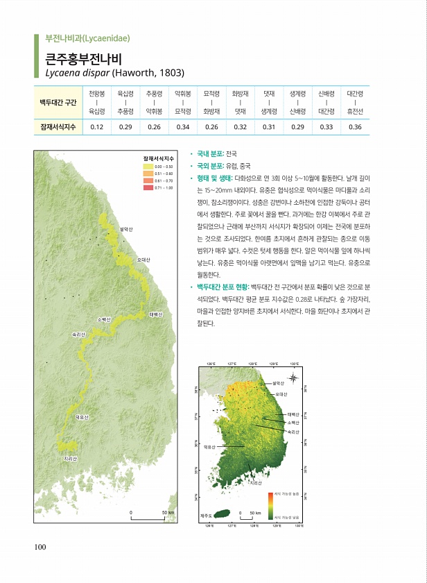 100 ? 국내 분포전국 ? 국외 분포유럽, 중국 ? 형태 및 생태다화성으로 연 3회 이상 5∼10월에 활동한다. 날개 길이 는 15∼20mm 내외이다. 유충은 협식성으로 먹이식물은 마디풀과 소리 쟁이, 참소리쟁이이다. 성충은 강변이나 소하천에 인접한 강둑이나 공터 에서 생활한다. 주로 꽃에서 꿀을 빤다. 과거에는 한강 이북에서 주로 관 찰되었으나 근래에 부산까지 서식지가 확장되어 이제는 전국에 분포하 는 것으로 조사되었다. 한여름 초지에서 흔하게 관찰되는 종으로 이동 범위가 매우 넓다. 수컷은 텃세 행동을 한다. 알은 먹이식물 잎에 하나씩 낳는다. 유충은 먹이식물 아랫면에서 잎맥을 남기고 먹는다. 유충으로 월동한다. ? 백두대간 분포 현황백두대간 전 구간에서 분포 확률이 낮은 것으로 분 석되었다. 백두대간...