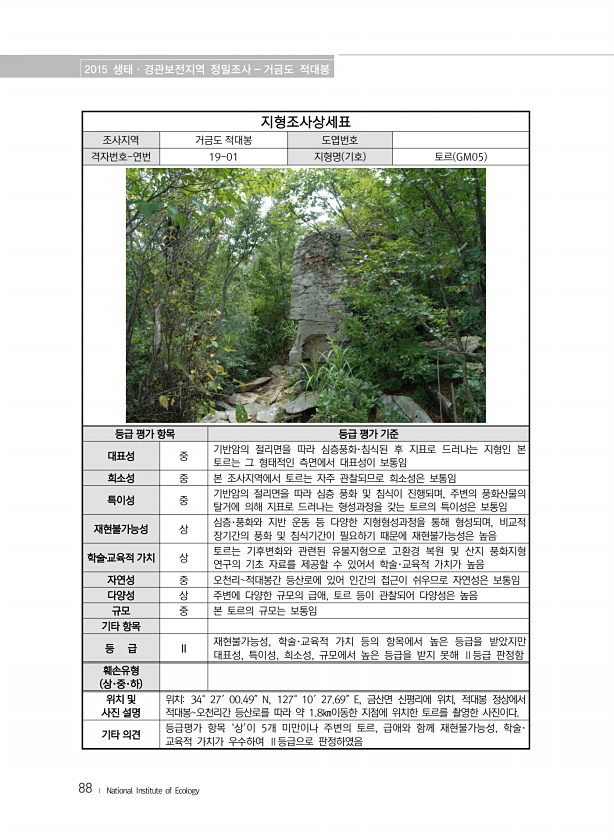 2015 생태·경관보전지역 정밀조사 거금도 적대봉 88 ? National Institute of Ecology 지형조사상세표 조사지역 거금도 적대봉 도엽번호 격자번호-연번 19-01 지형명 기호 토르 GM05 등급 평가 항목 등급 평가 기준 대표성 중 기반암의 절리면을 따라 심층풍화·침식된 후 지표로 드러나는 지형인 본 토르는 그 형태적인 측면에서 대표성이 보통임 희소성 중 본 조사지역에서 토르는 자주 관찰되므로 희소성은 보통임 특이성 중 기반암의 절리면을 따라 심층 풍화 및 침식이 진행되며, 주변의 풍화산물의 탈거에 의해 지표로 드러나는 형성과정을 갖는 토르의 특이성은 보통임 재현불가능성 상 심층·풍화와 지반 운동 등 다양한 지형형성과정을 통해 형성되며, 비교적 장기간의 풍화 및 침식기간이 필요하기 때문...
