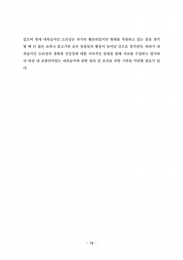 88 어져야 할 것이다. 동쪽 정자 뒤쪽에 쉬나무 수 개체가 분포하는데, 하부는 환삼덩굴, 상부 는 칡에 덮여 있었다. 쉬나무는 꽃이 하얗게 피고 가을에 열매가 붉게 익어 심미적 가치가 있으므로 덩굴성 식물의 제거가 필요하다. 미국수련과 마름 등 부엽성 수생식물은 관광자원으로써 가치가 있으므로 일정 면적을 제외하고 관리하여 개방수면을 확보해 줘야 할 것이다. 이는 두웅습지 내 물속에서 자라는 참통발, 새우가래, 구와말 등 수생식물의 생육에 영향을 주므로 두웅습지의 자연성을 유지 하는데도 도움을 줄 것으로 생각된다. 두웅습지의 북쪽 완충지역의 논에는 다양한 정수성 수생식물과 습생식물이 분포하였다. 이곳은 습지 내 생물종 다양성을 위해서 유지되어야 할 것으로 판단된다. 한편, 분포지가 조사지역에 포함되지 않아 ...