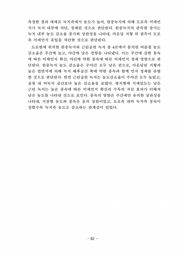 82 측정한 결과 대체로 녹지측에서 농도가 높아, 완충녹지에 의해 도로측 미세먼 지가 녹지 내부에 차단, 정체된 것으로 판단된다. 완충녹지의 관목량 증가는 녹지 내부 농도 감소율 증가와 상관성을 나타내, 마운딩 지형 위 관목이 도로 측 미세먼지 유입을 차단한 것으로 판단된다. 도로변에 위치한 완충녹지와 근린공원 녹지 총 4곳에서 분석된 여름철 농도 감소율은 주간에 높고, 야간에 낮은 경향을 나타냈다. 이는 주간에 강한 풍속 에 따른 미세먼지 확산, 야간에 약한 풍속에 따른 미세먼지 정체 영향으로 판 단된다. 완충녹지 농도 감소율은 주야간 모두 낮은 편으로, 마운딩된 지형과 높은 엽면적에 의해 녹지 배후공간 쪽에 약한 풍속과 함께 먼지 정체를 유발 한 것으로 판단된다. 반면 근린공원 녹지는 농도감소율이 주야간...