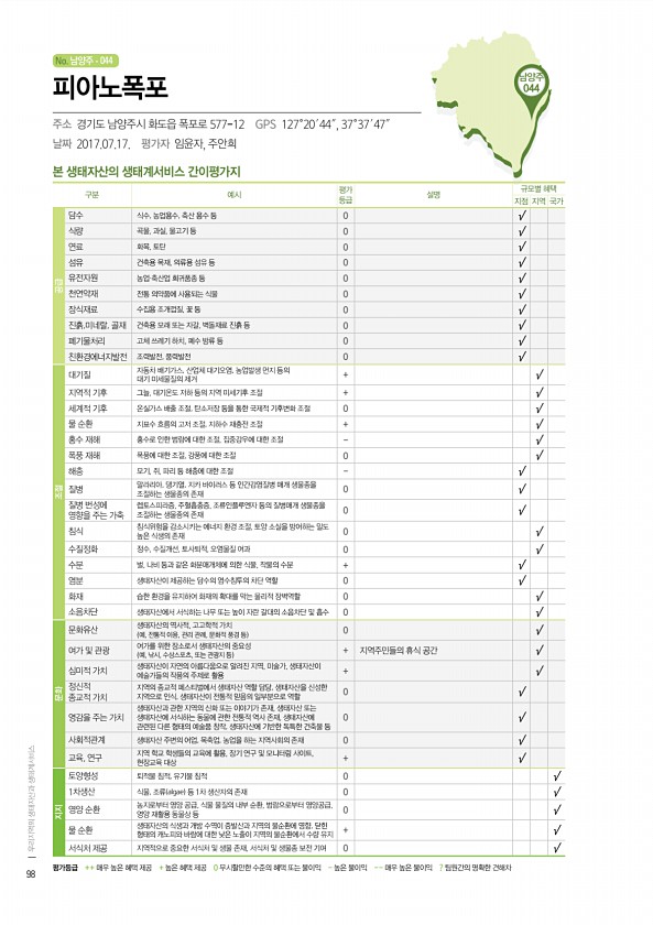 No. 남양주 남양주 044 본 생태자산의 생태계서비스 간이평가지 구분 예시 평가 등급 설명 규모별 혜택 지점 지역 국가 공급 담수 식수, 농업용수, 축산 용수 등 0 √ 식량 곡물, 과실, 물고기 등 0 √ 연료 화목, 토탄 0 √ 섬유 건축용 목재, 의류용 섬유 등 0 √ 유전자원 농업·축산업 희귀품종 등 0 √ 천연약재 전통 의약품에 사용되는 식물 0 √ 장식재료 수집용 조개껍질, 꽃 등 0 √ 진흙,미네랄, 골재 건축용 모래 또는 자갈, 벽돌재료 진흙 등 0 √ 폐기물처리 고체 쓰레기 하치, 폐수 방류 등 0 √ 친환경에너지발전 조력발전, 풍력발전 0 √ 조절 대기질 자동차 배기가스, 산업체 대기오염, 농업발생 먼지 등의 대기 미세물질의 제거 + √ 지역적 기후 그늘, 대기온도 저하 등의 지역 미세기...