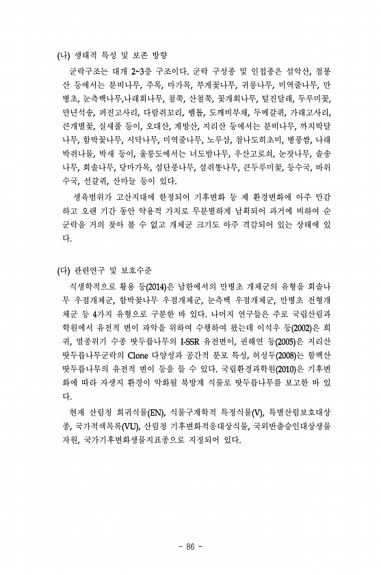 86 나 생태적 특성 및 보존 방향 군락구조는 대개 층 구조이다 군락 구성종 및 인접종은 설악산 점봉 산 등에서는 분비나무 주목 마가목 부게꽃나무 귀룽나무 미역줄나무 만 병초 눈측백나무 나래회나무 철쭉 산철쭉 꽃개회나무 털진달래 두루미꽃 만년석송 퍼진고사리 다람쥐꼬리 뱀톱 도깨비부채 두메갈퀴 가래고사리 큰개별꽃 실새풀 등이 오대산 계방산 지리산 등에서는 분비나무 까치박달 나무 함박꽃나무 시닥나무 미역줄나무 노루삼 참나도히초미 병풍쌈 나래 박쥐나물 박새 등이 울릉도에서는 너도밤나무 우산고로쇠 눈잣나무 솔송 나무 회솔나무 당마가목 섬단풍나무 섬쥐똥나무 큰두루미꽃 등수국 바위 수국 선갈퀴 산마늘 등이 있다 생육범위가 고산지대에 한정되어 기후변화 등 제 환경변화에 아주 만감 하고 오랜 기간 동안 약용적 가치로 무분...