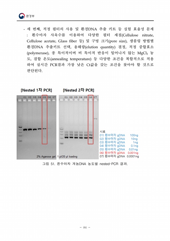 84 세 번째, 적정 필터의 사용 및 환경DNA 추출 키트 등 실험 효율성 문제 흰수마자 사육수를 이용하여 다양한 필터 재질 Cellulose nitrate, Cellulose acetate, Glass fiber 등 및 구멍 크기 pore size , 샘플링 방법별 환경DNA 추출키트 선택, 용해량 elution quantity 결정, 적정 중합효소 polymerase , 종 특이적이며 비 특이적 반응이 일어나지 않는 MgCl2 농 도, 결합 온도 annealing temperature 등 다양한 조건을 복합적으로 적용 하여 실시간 PCR결과 가장 낮은 Ct값을 갖는 조건을 찾아야 할 것으로 판단된다. 그림 51. 흰수마자 게놈DNA 농도별 nested-PCR결과.