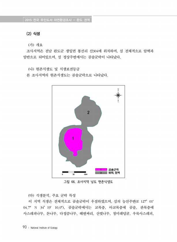 2015 전국 무인도서 자연환경조사 완도 권역 90 ? National Institute of Ecology 2 식생 가 개요 조사지역은 전남 완도군 생일면 봉선리 산304에 위치하며, 섬 전체적으로 암벽과 암반으로 되어있으며, 섬 정상주변에서는 곰솔군락이 나타났다. 나 현존식생도 및 식생보전등급 본 조사지역의 현존식생도는 곰솔군락으로 나타났다. 그림 66. 조사지역 낭도 현존식생도 다 식생분석, 주요 군락 특징 이 지역 식생은 전체적으로 곰솔군락이 우점하였으며, 섬의 능선주변 E 127。0104.7N 34。1910.0, 곰솔군락에서는 교목층, 아교목층에 곰솔, 관목층에 사스레피나무, 돈나무, 다정큼나무, 해변싸리, 산벚나무, 청미래덩굴,우묵사스레피,