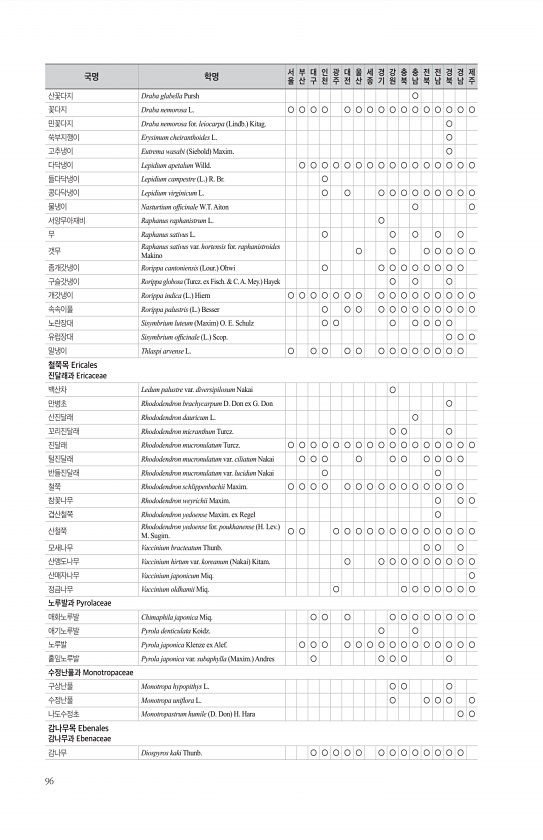 96 산꽃다지 Draba glabella Pursh ○ 꽃다지 Draba nemorosa L. ○ ○ ○ ○ ○ ○ ○ ○ ○ ○ ○ ○ ○ ○ ○ ○ 민꽃다지 Draba nemorosa for. leiocarpa Lindb. Kitag. ○ 쑥부지깽이 Erysimum cheiranthoides L. ○ 고추냉이 Eutrema wasabi Siebold Maxim. ○ 다닥냉이 Lepidium apetalum Willd. ○ ○ ○ ○ ○ ○ ○ ○ ○ ○ ○ ○ ○ ○ ○ ○ 들다닥냉이 Lepidium campestre L. R. Br. ○ 콩다닥냉이 Lepidium virginicum L. ○ ○ ○ ○ ○ ○ ○ ○ ○ ○ ○ 물냉이 Nasturtium offcinale W.T. Aiton ○ ○ 서양...